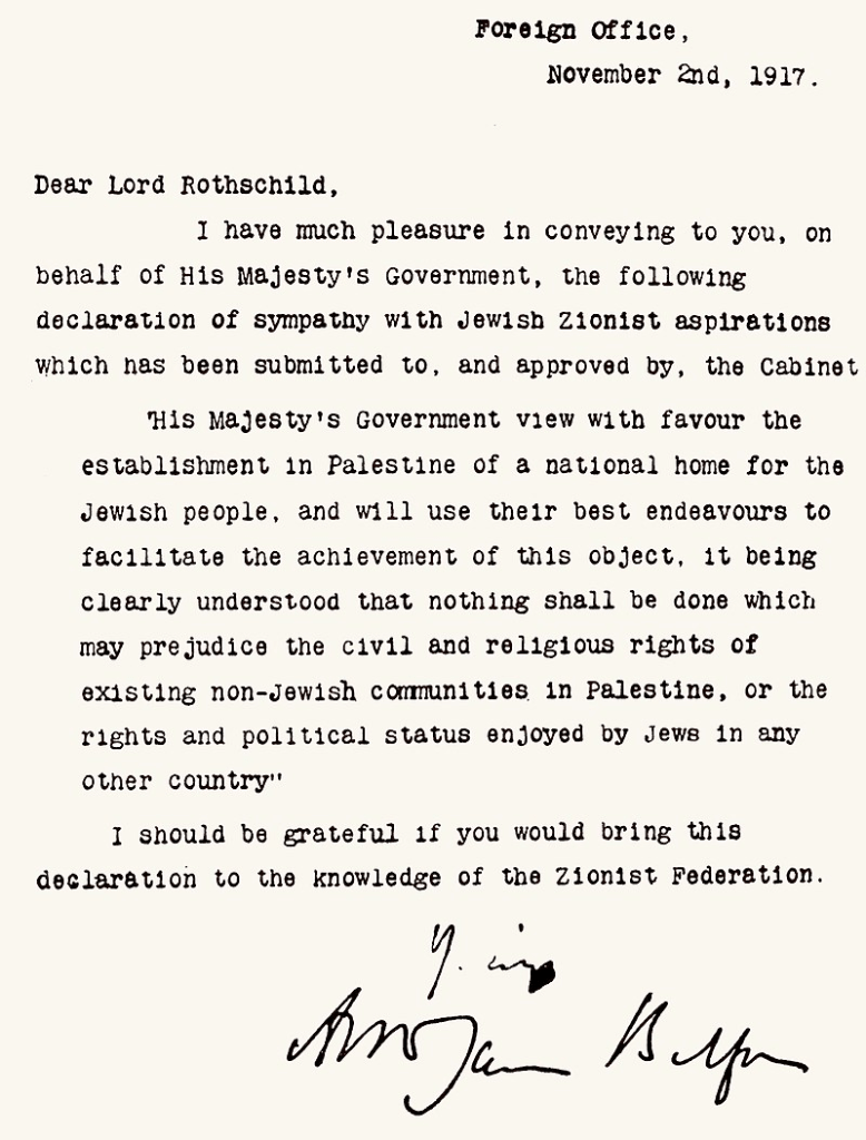 His Majesty’s Government view with favour the establishment in Palestine of a national home for the Jewish people, and will use their best endeavors to facilitate the achievement of this object, it being clearly understood that nothing shall be done which may prejudice the civil and religious rights of existing non-Jewish communities in Palestine or the rights and political status enjoyed by Jews in any other country.
